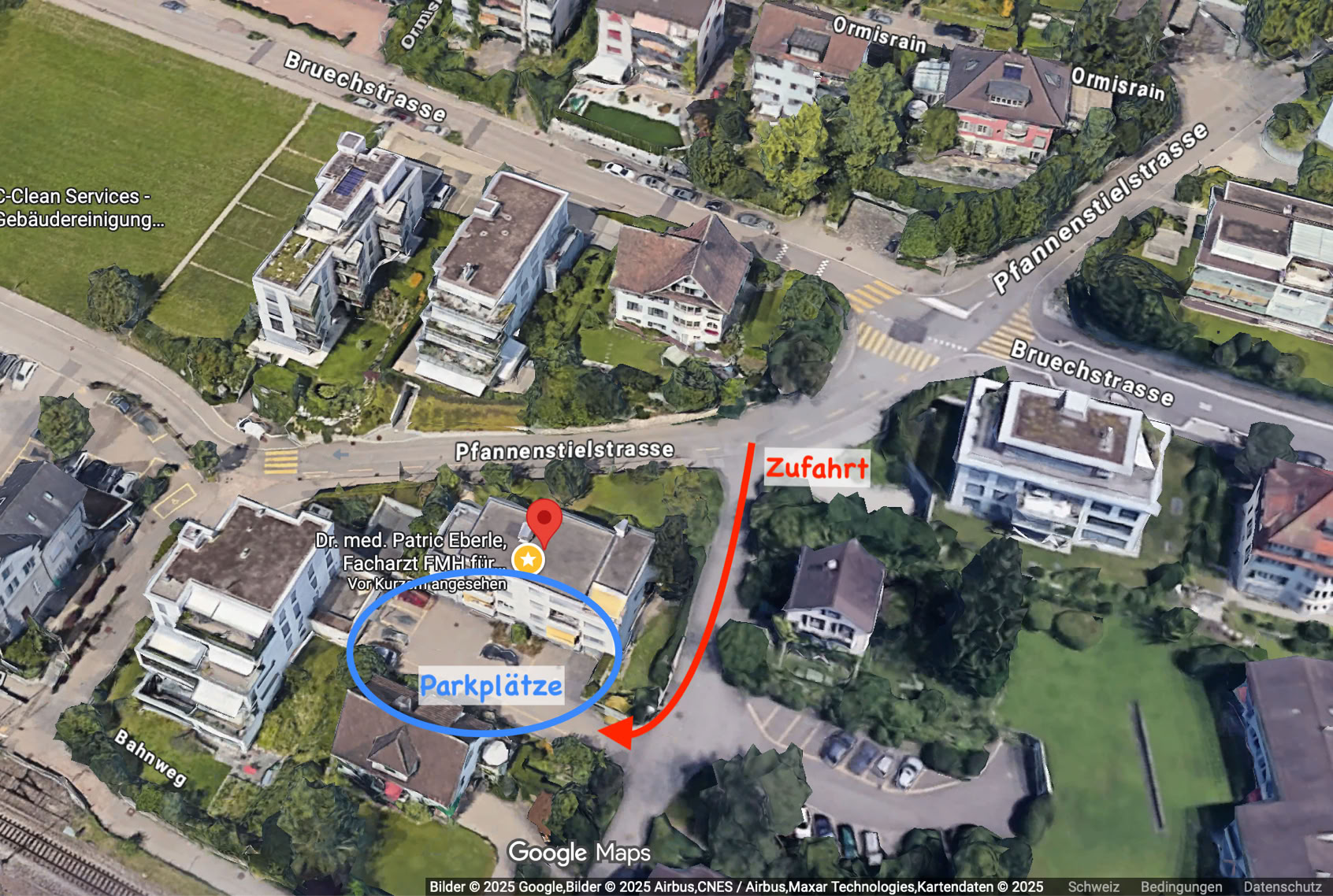 Diese befinden sich unterhalb der Praxis im Innenhof (gelbe Parkfelder), die Zufahrt ist über eine schmale Privatstrasse erlaubt. Praxiseingang direkt vom Parkplatz her möglich.