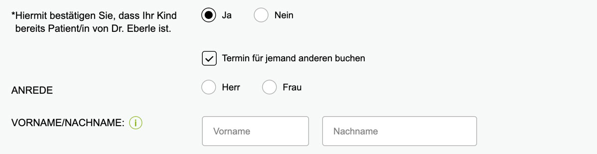 Erstellen Sie einen persönlichen Account auf Medicosearch.ch für sich selbst, und wählen Sie dann ☑︎ Termin für jemand anderen buchen, um Ihr Kind anzumelden.